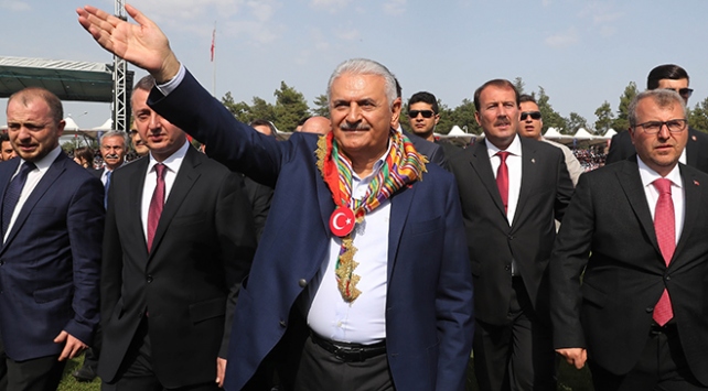 Başbakan Yıldırım, törende, üzerinde Türk bayrağı rozeti bulunan "yörük atkısı" ile "yörük kalpağı" taktı.