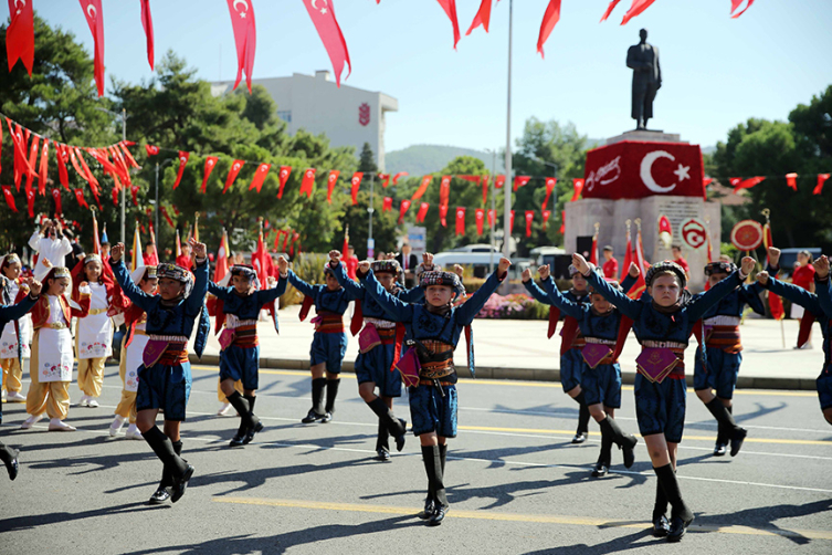 Vali Akbıyık, ve Büyükşehir Belediye Başkanı Aras'ın, Atatürk Anıtı'na çelenk sunmasının ardından saygı duruşunda bulunulup, İstiklal Marşı okundu. Daha sonra valilik makamında Vali Akbıyık, Aras ve milletvekilleri, vatandaşlar ve kurum temsilcileri ile bayramlaştı. Halk oyunları gösterisinin sunulduğu törenin sonunda, İl Jandarma Komutanlığı, Muğla Gençlik ve Spor İl Müdürlüğü ve öğrenciler tören geçişi yaptı. Törende, Muğla İl Jandarma Komutanlığı Zıpkınlar Komando Taburu gösteri gerçekleştirdi. Meydandaki törenin ardından Muğla'daki şehitliklere karanfil bırakılıp dua edildi.