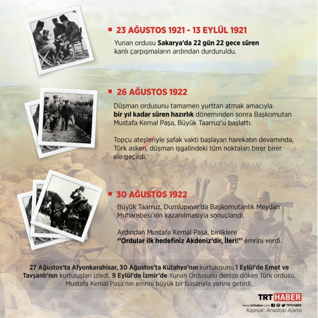 Saldırı için de bir yıl önce Yunan taarruzunun başladığı gün olan 26 Ağustos seçildi. Ordu, Başkomutan Gazi Mustafa Kemal Paşa'nın emriyle yeni bir Türk destanı için hücuma geçti.