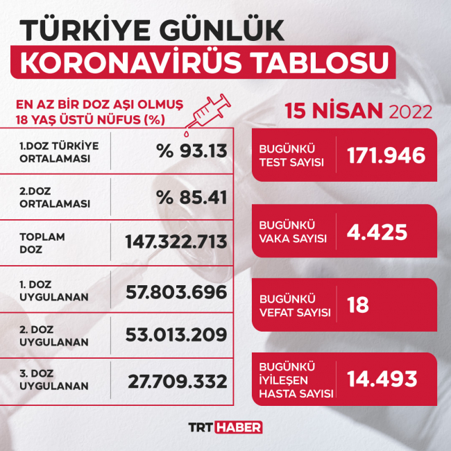 Buna göre, Türkiye'de son 24 saatte 171 bin 946 test yapıldı, 4 bin 425 kişinin testi pozitif çıktı.