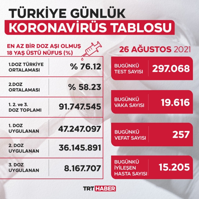 Buna göre, Türkiye'de son 24 saatte 297 bin 68 COVID-19 testi yapıldı, 19 bin 616 kişinin testi pozitif çıktı.