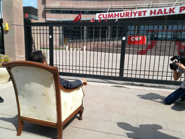 CHP Keçiören İlçe örgütüne kayıtlı Abbas Canyurt isimli partili, "evinden getirdiğini" söylediği bir koltuğu CHP Genel Merkezi binasının önüne koyarak, oturdu.
