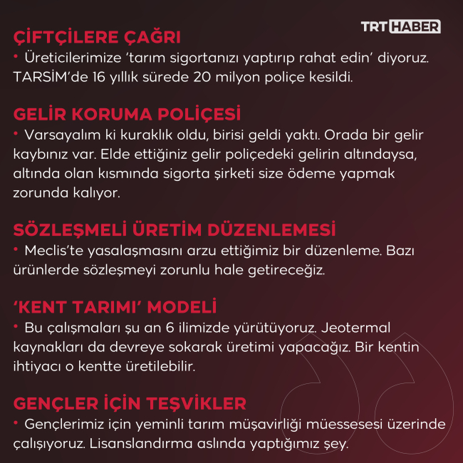 Eksik gördüğümüz şey şu. Bizim bu yüzde 21'ler mertebesinde 16 yıl geçmiş olmasına rağmen. Artırılsın istiyoruz. Aracılığınızla üreticilerimize seslenmek istiyoruz. Tarım sigortanızı yaptırın, rahat edin. Hükümet size bu konularda 16 yıldan beri destek veriyor. Bu bağlamda bir poliçe daha geliştirdik. Gelir koruma poliçesi… Siz eğer ürünü yetiştirirken istiyorsanız ki şu kadar gelir elde etmek istiyorum. Bu bir poliçeye dönüştürülüyor. Sigorta şirketi bu poliçenin priminin yüzde 40'ını üreticiden alıyor, yüzde 60'ını biz veriyoruz. Varsayalım ki kuraklık oldu, birisi geldi yaktı. Orada bir gelir kaybınız var. O elde ettiğiniz gelir poliçedeki gelirin altındaysa, altında olan kısmında sigorta şirketi size ödeme yapmak zorunda kalıyor.
