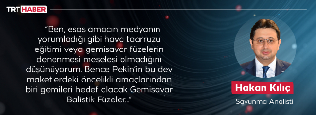 “Ben, esas amacın medyanın yorumladığı gibi hava taarruzu eğitimi veya gemisavar füzelerin denenmesi meselesi olmadığını düşünüyorum. Bence Pekin’in bu dev maketlerdeki öncelikli amaçlarından biri, ilk örneği DF-21 Çin balistik füzesi ile ortaya çıkan Çin yapımı DF-21, DF-26 ASBM'ler yani gemileri hedef alacak Gemisavar Balistik Füzeler…