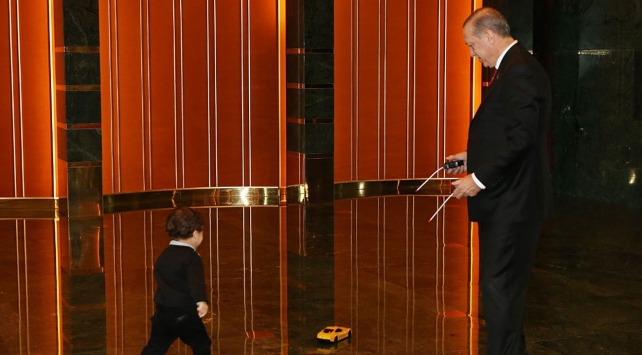 Çocukları sevmesiyle bilinen Cumhurbaşkanı Erdoğan'ın paylaşımında uzaktan kumandalı arabayla oynarken çekildiği fotoğraf bulunuyor.