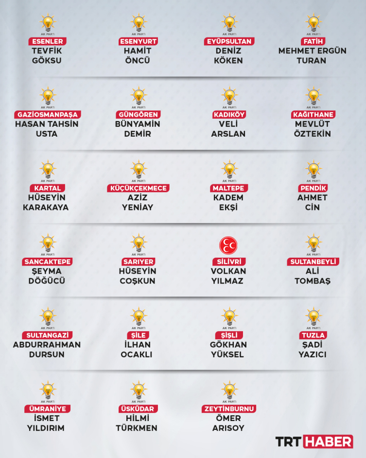 Fatih Belediye Başkan adayı Mehmet Ergün Turan, Gaziosmanpaşa Belediye Başkan adayı Hasan Tahsin Usta, Güngören Belediye Başkan adayı Bünyamin Demir, Kadıköy Belediye Başkan adayı Veli Arslan, Kağıthane Belediye Başkan adayı Mevlüt Öztekin, Kartal Belediye Başkan adayı Hüseyin Karakaya, Küçükçekmece Belediye Başkan adayı Aziz Yeniay, Maltepe Belediye Başkan adayı Kadem Ekşi, Pendik Belediye Başkan adayı Ahmet Cin, Sancaktepe Belediye Başkan adayı Şeyma Döğücü, Sarıyer Belediye Başkan adayı Hüseyin Coşkun, Silivri Belediye Başkan adayı Volkan Yılmaz, Sultanbeyli Belediye Başkan adayı Ali Tombaş, Sultangazi Belediye Başkan adayı Abdurrahman Dursun, Şile Belediye Başkan adayı İlhan Ocaklı, Şişli Belediye Başkan adayı Gökhan Yüksel, Tuzla Belediye Başkan adayı Şadi Yazıcı, Ümraniye Belediye Başkan adayı İsmet Yıldırım, Üsküdar Belediye Başkan adayı Hilmi Türkmen, Zeytinburnu Belediye Başkan adayı Ömer Arısoy.