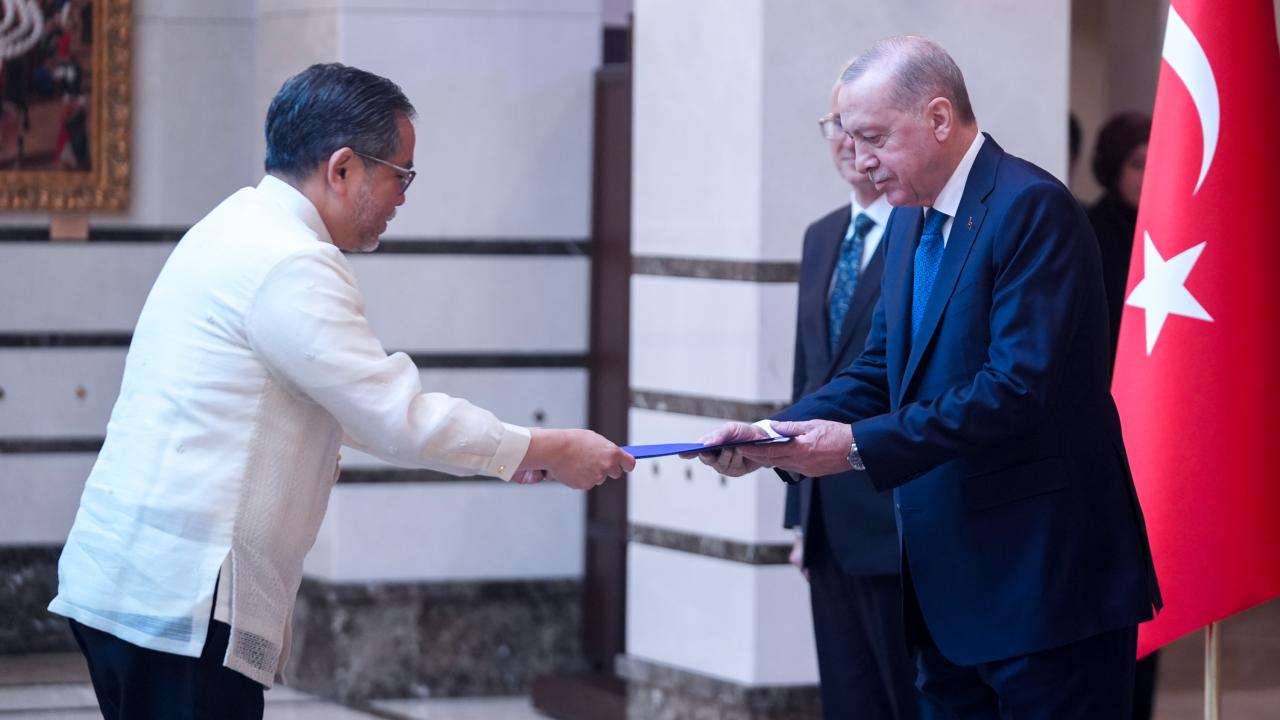 Cumhurbaşkanlığı Külliyesi'ndeki kabulde, Filipinler Büyükelçisi Jamie Ramon Torre Ascalon JR, Kenya Büyükelçisi Anthony Mwaniki Muchiri, Kolombiya Büyükelçisi Yenniffer Edilma Parra Moscoso, Peru Büyükelçisi Luz Betty Caballero Morales ve Rusya Büyükelçisi Sergey Vasilievich Vershinin, Cumhurbaşkanı Erdoğan'a güven mektuplarını sundu.