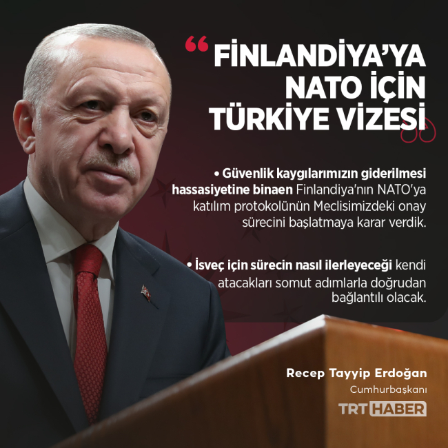 Ülkemizin güvenlik kaygılarını gidermek yolunda gösterdiği hassasiyet ve kaydedilen mesafeye binaen Finlandiya'nın NATO'ya katılım protokolünün Meclis'imizdeki onay sürecini başlatmaya karar verdik. Bu kararımızın ülkelerimiz başta olmak üzere ittifakımız için hayırlı olmasını diliyorum. Finlandiya'nın üyeliğiyle daha da güçlenerek NATO, bu sayede küresel güvenlik ve istikrarın muhafazasında inanıyorum ki etkin rol oynayacaktır. Onay sürecinin tamamlanmasıyla birlikte Finlandiya'yla ilişkilerimiz NATO müttefikliği zemininde tahkim edilmiş olacaktır."