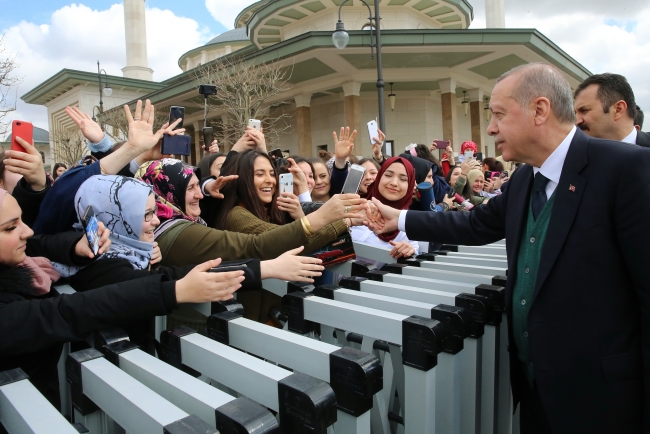 Cuma namazı için Beştepe Millet Camisi'ne gelenleri de selamlayan Erdoğan, bir bebeği kucağına alarak sevdi ve vatandaşlarla hatıra fotoğrafı çektirdi.