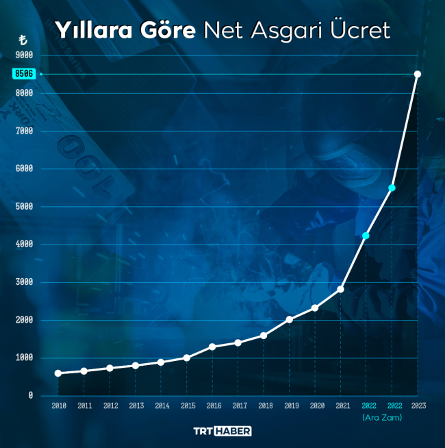 Erdoğan'ın açıklamasına göre, 2023 yılında brüt asgari ücret 10 bin 8, net asgari ücret 8 bin 506,80 lira olacak. Net asgari ücretteki artış oranı ocak ayına göre yüzde 100, temmuz ayına göre yüzde 54,66 olurken, yıllık ortalama artış oranı ise yüzde 74,43 olarak gerçekleşti.