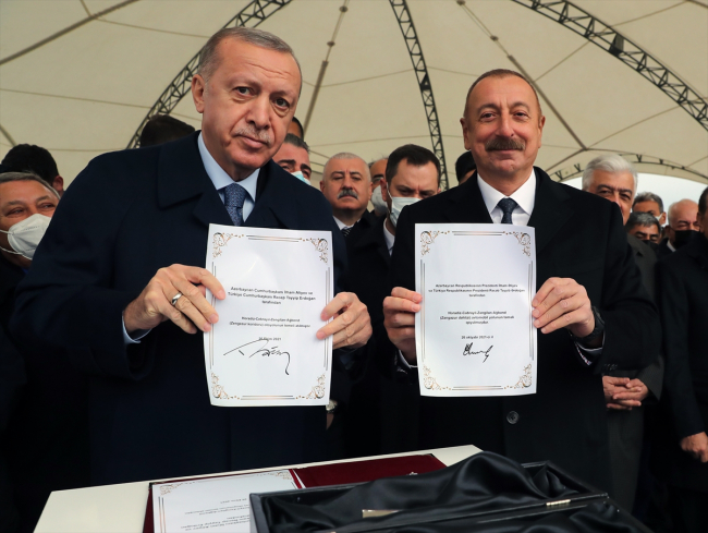 Cumhurbaşkanı Erdoğan ve Azerbaycan Cumhurbaşkanı Aliyev, günün anısına imzaladıkları metni, kapsül içinde temele attı.