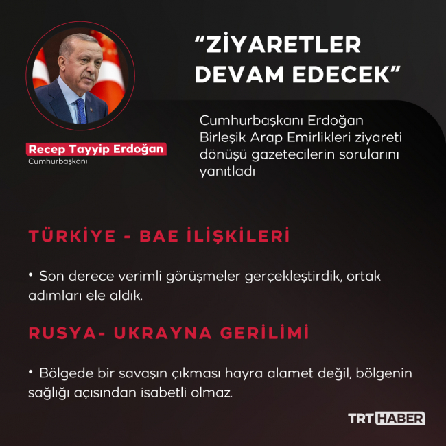 Cumhurbaşkanı Recep Tayyip Erdoğan, Birleşik Arap Emirlikleri ziyareti dönüşünde, uçakta gazetecilere gündeme ilişkin değerlendirmelerde bulundu.