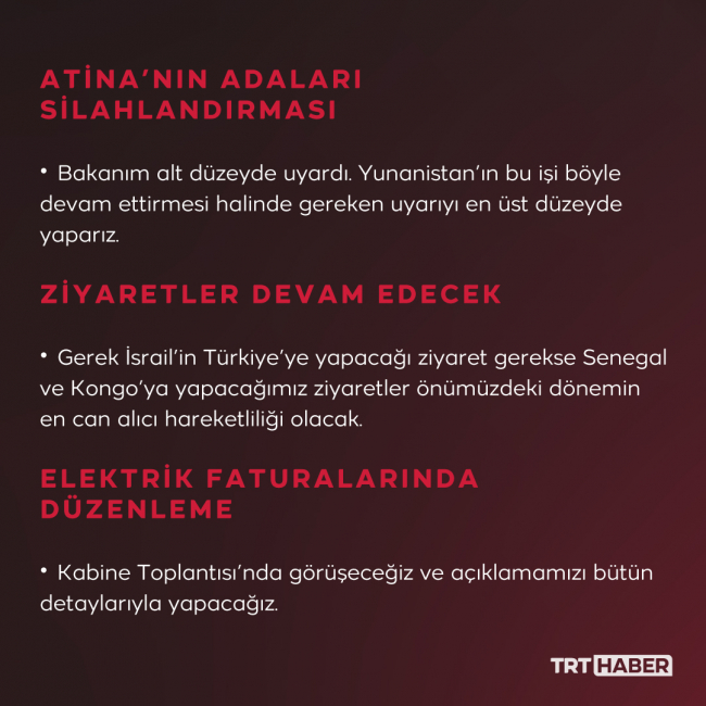 Silahsızlandırılmış statüde bulunan adalarda anlaşmalara aykırı olarak yürütülen askeri faaliyetlere sessiz kalmamız mümkün değil. Nitekim bu konuyu BM’nin gündemine taşıdık. Önümüzdeki dönemde de gündemde tutmayı sürdüreceğiz. Bu konuda ayrıca Bakanımız bunlara bir uyarıda bulundu. Fakat Yunanistan’ın bu işi böyle devam ettirmesi halinde tabii ki gerekli olan neyse bu uyarıyı biz de en üst düzeyde yaparız. Çünkü malum, adalar konusu hep tartışmalıdır. Bizi bu tartışmalı konuları gündeme getirme mecburiyetinde bırakabilirler. Bunun için de Bakanım “Bizi bu konuları tartışmaya açmak zorunda bırakmasınlar” diye onlara alt düzeyden bir uyarı yaptı. Hayırlı da oldu.