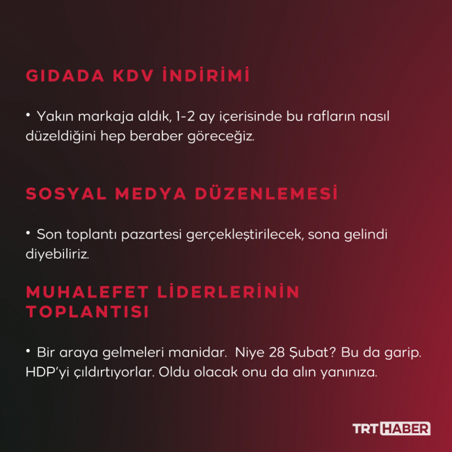 Bir defa hiç endişeli olmayın. Şu an itibarıyla gerek Hazine ve Maliye Bakanlığımız gerek Ticaret Bakanlığımız bunları yakın markaja almış durumda. Bazı ürünlerde KDV indirimi sonrası fiyatlar belli oranlarda geri gelmiş görünüyor. Öyle veya böyle inecek. Ben tabii Hazine ve Maliye Bakanımıza “Süratle bunların üzerine gitmeniz gerekiyor” dedim. Onların patronlarıyla da bizzat Nureddin Bey görüşmek suretiyle bunların üzerine gitmeye ve bir de bunları teftişe devam edeceğiz.