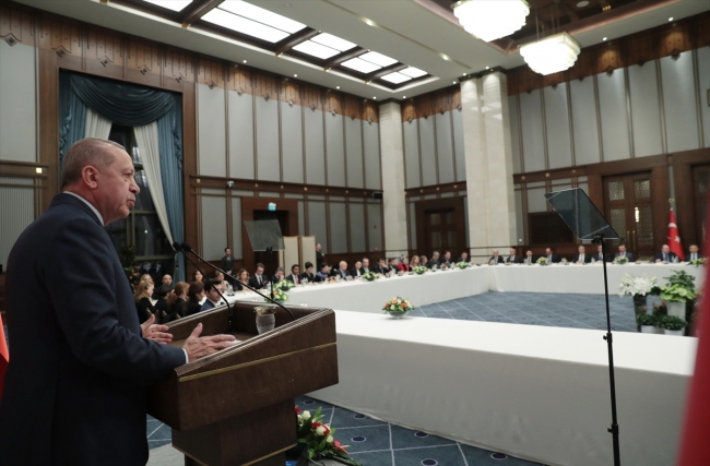 Erdoğan, Cumhurbaşkanlığı Külliyesi'nde ABD Ticaret Odası ve Amerikan Türk Konseyi üyelerini kabulünde, Türkiye'nin tüm olumsuz şartlara rağmen bölgesinde bir istikrar adası olmaya devam ettiğini söyledi.