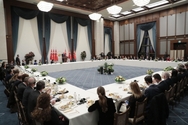 Cumhurbaşkanı Recep Tayyip Erdoğan, Cumhurbaşkanlığı Külliyesi'nde ABD Ticaret Odası ve Amerikan Türk Konseyi üyelerini kabulünde, heyeti misafir etmekten duyduğu memnuniyeti dile getirerek, ziyaretin ekonomik ve ticari ilişkiler başta olmak üzere Türk-Amerikan iş birliğinin güçlenmesine katkı sağlamasını diledi.