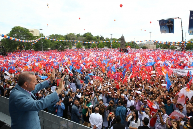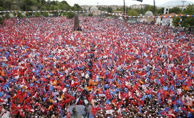 Şimdi sizlere soruyorum, 24 Haziran'da güçlü hükümet için Cumhurbaşkanlığında şahsımı, Meclis'te AK Parti'yi desteklemeye hazır mıyız?, 24 Haziran'da güçlü hükümet için Cumhurbaşkanlığında şahsımı, Meclis'te AK Parti'yi desteklemeye hazır mıyız?, 24 Haziran'da güçlü hükümet için Cumhurbaşkanlığında şahsımı, Meclis'te AK Parti'yi desteklemeye hazır mıyız? Vakit Konya vakti diyor muyuz? Vakit Türkiye vakti diyor muyuz? Maşallah ne kadar bir coşku, ne kadar güzel bir hava unutmayın yaparsa yine AK Parti yapar. İnşallah sizlerin desteği ile irade, erdem ve cesaretle Türkiye şahlanacak, Konya şahlanacak.