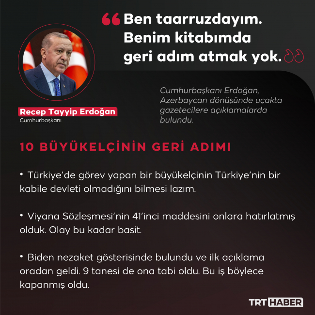 10 büyükelçi hadisesinde CHP Genel Başkanı Kemal Kılıçdaroğlu başta olmak üzere bazı çevrelerin eleştirilerine yönelik değerlendirmeleri sorulan Erdoğan, "Bunlardan biri de geçmişte Bakü’de büyükelçi olarak görev yapmıştı, şimdi CHP’de güya siyaset yapıyor. İlham Bey’le konuşurken o bile 'Ben bu adamı bir daha bu kapıdan içeri sokmam' dedi. Çünkü Azerbaycan’a da ihanet etti. Sen önce bir defa büyükelçilik yaptığın ülkenin siyasetine saygılı olmayı öğren. Bunu öğrenmedi ki bu adam. Şu anda da rastgele işte nasıl olduysa siyaset yapıyor. Biz bu tür siyasetçileri cepten çıkarıyoruz. Bunların siyaseti öğrenmeleri için daha çok fırın ekmek yemeleri lazım. Bunlar büyükelçilik yapmış, siyasetçilik değil. Siyasetçilik başka bir şey, büyükelçilik başka bir şey." dedi.