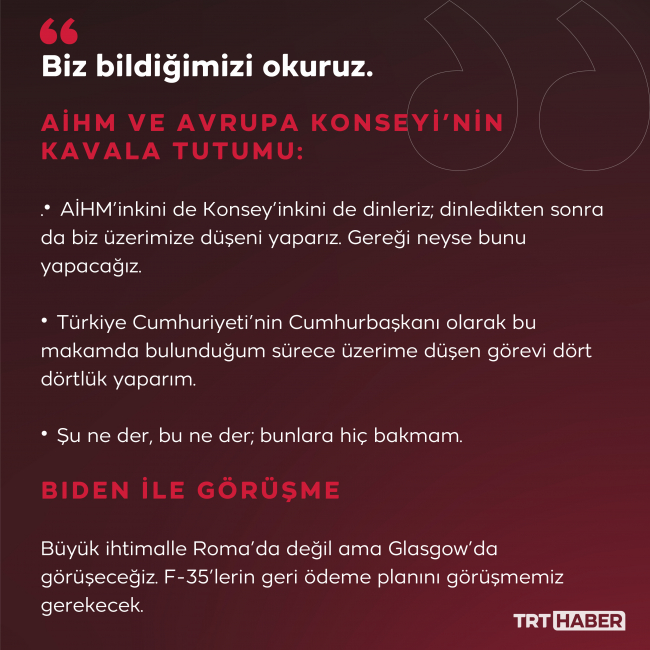 "Benim herhangi bir beklentim yok. Benim sadece tek beklentim var; biz bildiğimizi okuruz. Konsey bildiğini mi okur; okusun. Onlar ne okuyor; dinleriz, görürüz. AİHM’inkini de Konsey’inkini de dinleriz; dinledikten sonra da biz üzerimize düşeni yaparız. Gereği neyse bunu yapacağız. Ben Türkiye Cumhuriyeti’nin Cumhurbaşkanı olarak bu makamda bulunduğum sürece üzerime düşen görevi dört dörtlük yaparım. Acaba şu ne der, bu ne der; bunlara hiç bakmam. Benim aldığım terbiye bu, yetişme tarzım bu. Ölene kadar da aynen bu istikamette devam ederim, devam edeceğim."