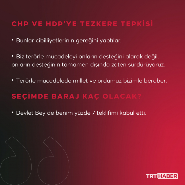 "Seçim Yasası ve Siyasi Partiler Kanunu’yla ilgili de Feti Bey’in bizim arkadaşlara vermiş olduğu çalışma metni de arkadaşlarımızın elinde. Burada özellikle yüzde 5, yüzde 7 meselesi gündemdeydi. Bu konuda Devlet Bey, benim yüzde 7 teklifimi kendileri de aynen kabul ettiler. 'Bu noktada siz nasıl uygun görüyorsanız bizim için o kabuldür' dediler. Dolayısıyla bu yüzde 7 meselesini şu anda Kanunda bu şekilde, bizler de arkadaşlarımıza söyleyeceğiz. Onun üzerinden hareket edeceğiz. Öbür tarafta tabi Anayasa ile ilgili çalışmalarımız da aynen devam edecek. Arkadaşlarımız bu çalışmayı tamamen bitirdikten sonra o da Meclis gündemine gelecektir. Ama biz de tabi Meclis’te bir altyapının olmasının gereğine inanıyoruz. Bu konuda gönül arzu ediyor ki Meclis’teki diğer siyasi partiler de buna hazır olsunlar, onlar da bu konuda 'Tamam biz de yaparız' desinler ama şu anda onlardan aldığımız ses seda tam aksine, böyle bir şey yok."