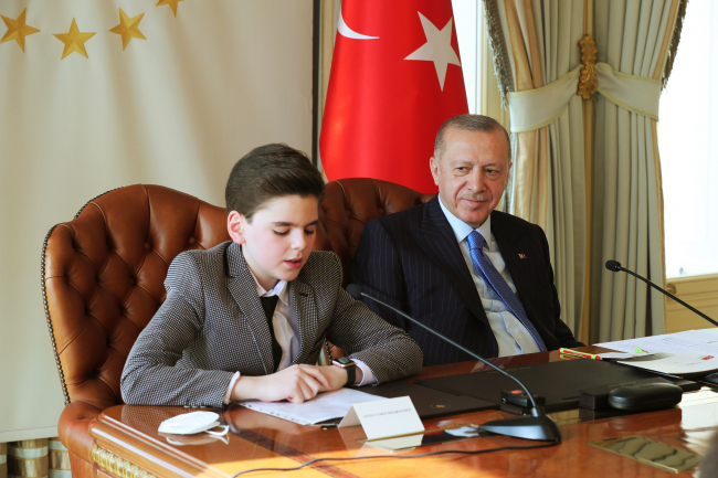 Misafirleriyle tek tek selamlaşan Erdoğan, koltuğunu 8. sınıf öğrencisi Şükrü Emre Eren'e bıraktı. Cumhurbaşkanı Erdoğan, Eren'e "Sayın Cumhurbaşkanı hoş geldiniz." diye hitap ederken Eren de "Hoş bulduk." dedi.