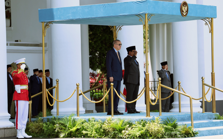Endonezya Cumhurbaşkanı Subianto, Erdoğan'ı giriş kapısında karşıladı. Erdoğan ve Subianto'nun tören alanındaki yerlerini almasının ardından, askeri bando iki ülkenin milli marşlarını çaldı, top atışı yapıldı.