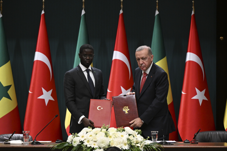 Cumhurbaşkanı Recep Tayyip Erdoğan ve Senegal Cumhurbaşkanı Beşir Cuma Fay, Cumhurbaşkanlığı Külliyesi'nde baş başa yaptıkları görüşme ve heyetlerin bir araya gelmesinin ardından ortak basın toplantısı düzenledi.