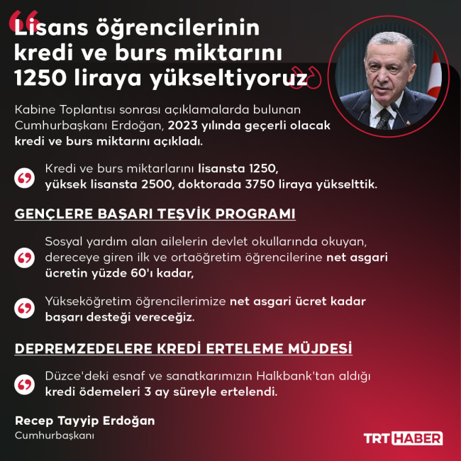"2023 yılı kredi burs rakamını lisans öğrencilerinde 850 liradan 1250 liraya, yüksek lisans öğrencileri için 1700 liradan 2 bin 500 liraya, doktora öğrencileri için 2 bin 550 liradan 3 bin 750 liraya çıkartıyoruz. Yeni kredi ve burs rakamlarının tüm öğrencilerimize hayırlı ve uğurlu olmasını diliyorum."
