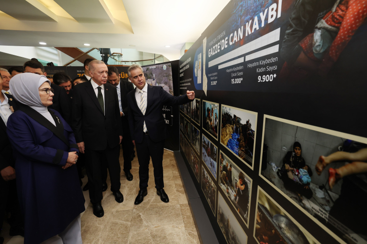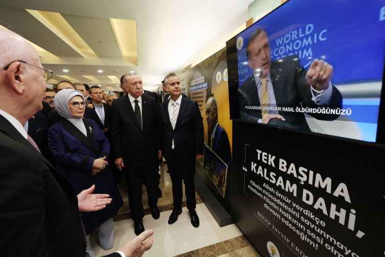 İsviçre'nin Davos kentinde 2009'da düzenlenen Dünya Ekonomik Forumu Paneli'nde dönemin başbakanı Erdoğan'ın "one minute" çıkışının ve İsrail'in zulümlerinin de yer aldığı sergide Cumhurbaşkanı Erdoğan'a eşi Emine Erdoğan, eski TBMM Başkanı İsmail Kahraman, Cumhurbaşkanlığı İletişim Başkanı Fahrettin Altun, Cumhurbaşkanlığı Özel Kalem Müdürü Hasan Doğan, AK Parti Genel Sekreteri Fatih Şahin ve AK Parti Genel Merkez Kadın Kolları Başkanı Ayşe Keşir de eşlik etti.
