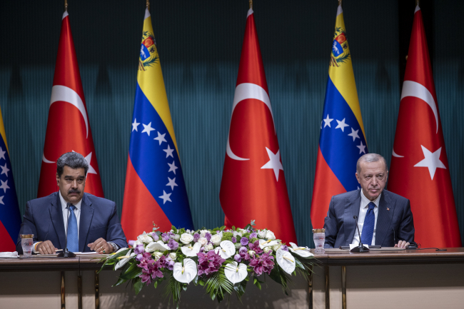 Cumhurbaşkanı Erdoğan ve Venezuela Devlet Başkanı Nicolas Maduro, Cumhurbaşkanlığı Külliyesi'ndeki baş başa ve heyetler arası görüşmeler ile anlaşmaların imza töreninin ardından ortak basın toplantısı düzenledi.