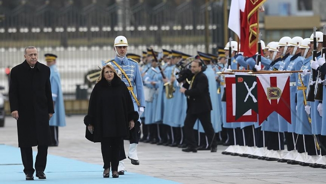 Cumhurbaşkanı Recep Tayyip Erdoğan, mevkidaşını Cumhurbaşkanlığı Külliyesi'nin ana giriş kapısında karşıladı. İki Cumhurbaşkanı'nın tören alanındaki yerlerini almalarının ardından, 21 pare top atışı eşliğinde iki ülkenin milli marşları çalındı.