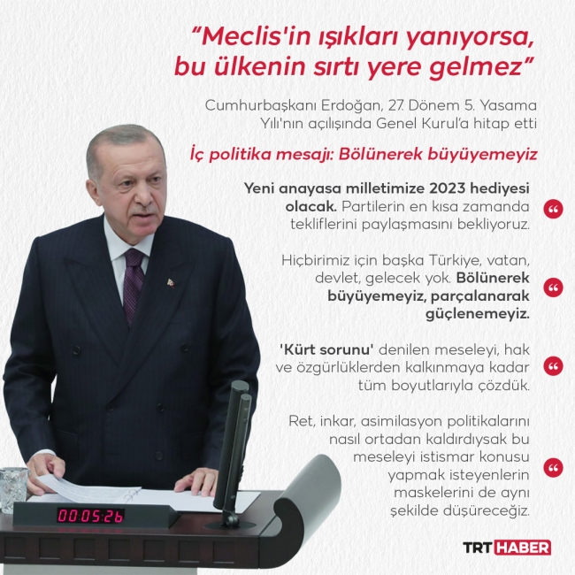 Tıpkı geçtiğimiz bir asır gibi, önümüzdeki asrın şekillenmesinde de Millet Meclisimizin eşsiz bir rolü olacağına tüm kalbimle inanıyorum. Geçtiğimiz 19 yılda eğitimden sağlığa, güvenlikten adalete, ulaşımdan enerjiye kadar devlet ve millet hayatının her alanında gerçekleştirdiğimiz büyük atılımı, bu vizyonun temel altyapısı olarak görüyoruz. Artık siyasi olmaktan çıkıp milli hedefler haline dönüşen bu vizyonu, Türkiye Büyük Millet Meclisimizden başlayarak, hiçbir ayrım gözetmeksizin, ülkemizin tüm fertleriyle hep birlikte sahiplenmeliyiz. Çünkü hiçbirimiz için başka Türkiye yok. Hiçbirimiz için başka vatan yok. Hiçbirimiz için başka devlet yok. Hiçbirimiz için başka gelecek yok. Aklımızdan asla çıkarmamalıyız ki bölünerek büyüyemeyiz. Parçalanarak güçlenemeyiz. Husumeti körükleyerek kardeşliği kökleştiremeyiz. Saplantılara sarılarak demokrasimizi ilerletemeyiz. Bizi biz yapan değerlerden vazgeçerek ufkumuzu derinleştiremeyiz. Dünyanın gittiği istikamet, farklılıklarımızı değil müştereklerimizi öne çıkararak birbirimize daha sıkı kenetlenmemiz gerektiğini gösteriyor.