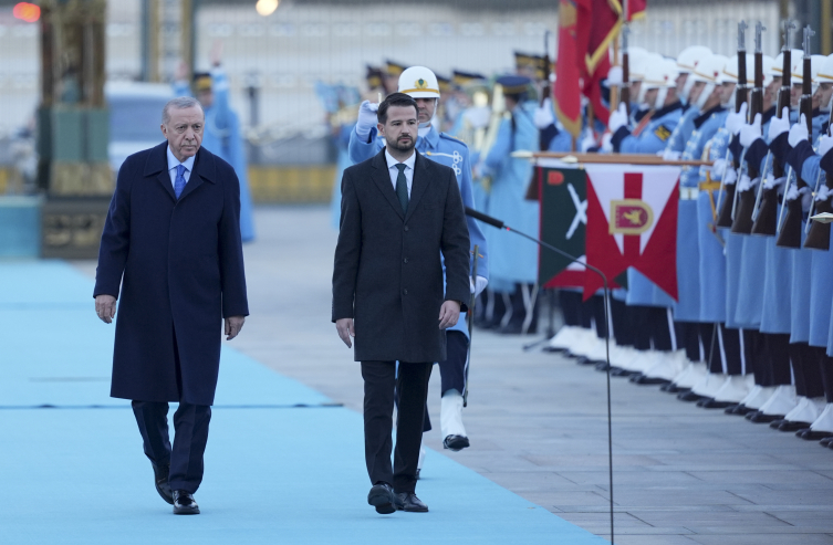 Erdoğan ve Milatoviç, merdivenlerde Türkiye ve Karadağ bayrakları önünde tokalaşarak basın mensuplarına poz verdi.