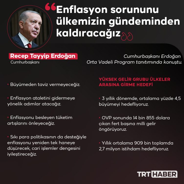 Cumhurbaşkanı Recep Tayyip Erdoğan, Türkiye ekonomisine ilişkin hedef ve politikaların yer aldığı Orta Vadeli Program'ı açıkladı.