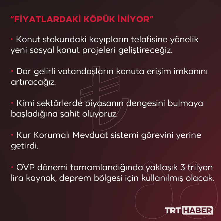 Aziz milletim Orta Vadeli Programda uygulayacağımız politika sepetiyle, enflasyon sorununu ülkemizin gündeminden kaldıracağız. Para, maliye ve gelirler politikalarında eşgüdüm hareket edilecek enflasyon ataletini gidermeye yönelik adımlar atacağız. Makro ihtiyati politikalarda sadeleşmeye gidelerek ekonomik dengeleri bozucu ve enflasyonu besleyen tüketim artışlarını önleyeceğiz. Yatırım, istihdam, üretim ve ihracata dayalı büyüme politikaları ile fiyat istikrarı odaklı olarak reel sektörü destekleyen finansman imkanı sağlayacağız.