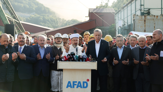 Aziz milletim, değerli basın mensupları sizleri saygıyla selamlıyorum. Türkiye Taşkömürü İşletmeleri Amasra Maden Ocağı'nda dün akşam saatlerinde meydana gelen patlama nedeniyle fevkalade milletçe üzgünüz. Patlamada hayatını kaybeden işçilerimize Allah'tan rahmet, ailelerine ve milletimize başsağlığı diliyorum. Madenden yaralı olarak kurtulan ve tedavisi süren işçilerimize rabbimden acil şifalar diliyorum.