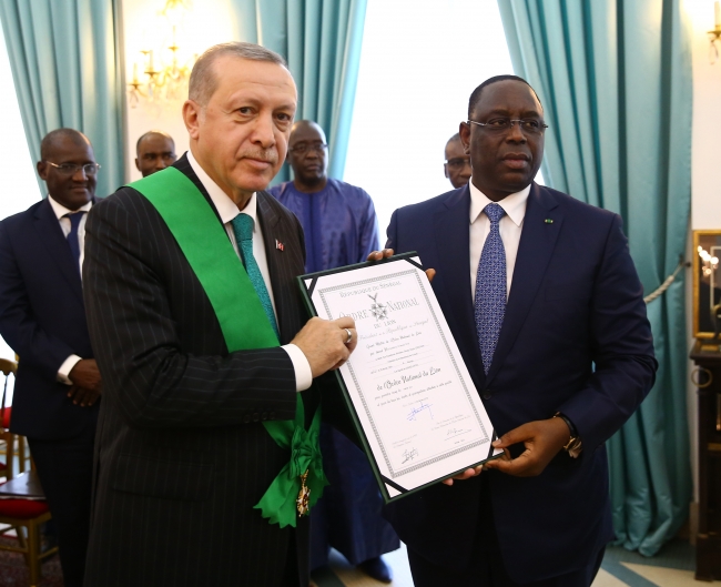 Senegal Cumhurbaşkanı Sall, Cumhurbaşkanı Erdoğan'a Senegal'in en yüksek nişanı olan "Senegal Yüksek Devlet Nişanı"nı takdim etti.