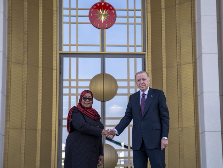 Erdoğan ve Hassan, merdivenlerde Türkiye ve Tanzanya bayrakları önünde tokalaşarak gazetecilere poz verdi.