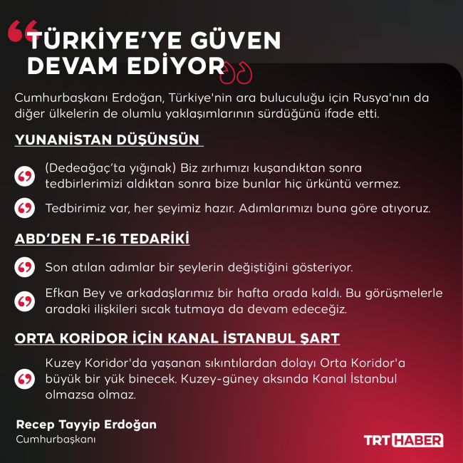 Özellikle F16 konusunda bu son atılan adımlar veya son gelişmeler bir şeylerin değiştiğini gösteriyor. Tabii bütün bu adımları aynı anda Rusya da takip ediyor. Ne oluyor, ne gidiyor? Şimdi bize düşen de tabii burada ilgili arkadaşlar gerek Dışişleri Bakanımız, gerek Milli Savunma Bakanımız gerekse bunun dışında bizim liderlerle yaptığımız görüşmelerde bunları konuşuyoruz, paylaşıyoruz, Hatta hatta son Birleşmiş Milletler Genel Kurulu'na gittiğimizde orada tabii Amerikalı senatörlerle de görüşmeler yaptım. Onlarla da bu konuları görüştüm. Yani az önce söylediğim ifadeyle bunu bütünleştiriyorum; bunların hepsi tedbir paketinin içerisinde yer alan konulardır. Bunları da orada Cumhuriyetçi, Demokrat senatörlerle görüştük. Hatta Efkan Bey ve arkadaşlarımızı orada bıraktık. Onlar orada yaklaşık bir hafta daha kaldılar. Onlar da Kongre üyeleriyle görüşmeler yaptılar. Bu görüşmelerle de aradaki ilişkileri sıcak tuttuk, sıcak tutuyoruz, tutmaya da devam edeceğiz.