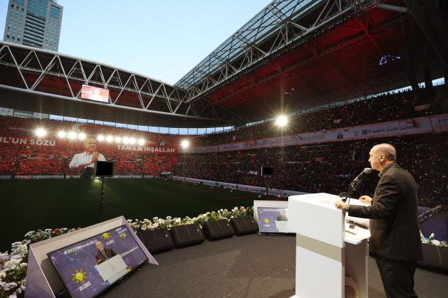 Erdoğan, partisinin İstanbul İl Başkanlığınca NEF Stadyumu'nda düzenlenen "İstanbul'un Sözü: Birlik, İrade, Zafer" programında, katılımcıları selamlayarak, Fatih'in yadigarı İstanbul'un 2053 vizyonu için gece gündüz demeden çalışanlara şükranlarını iletti.