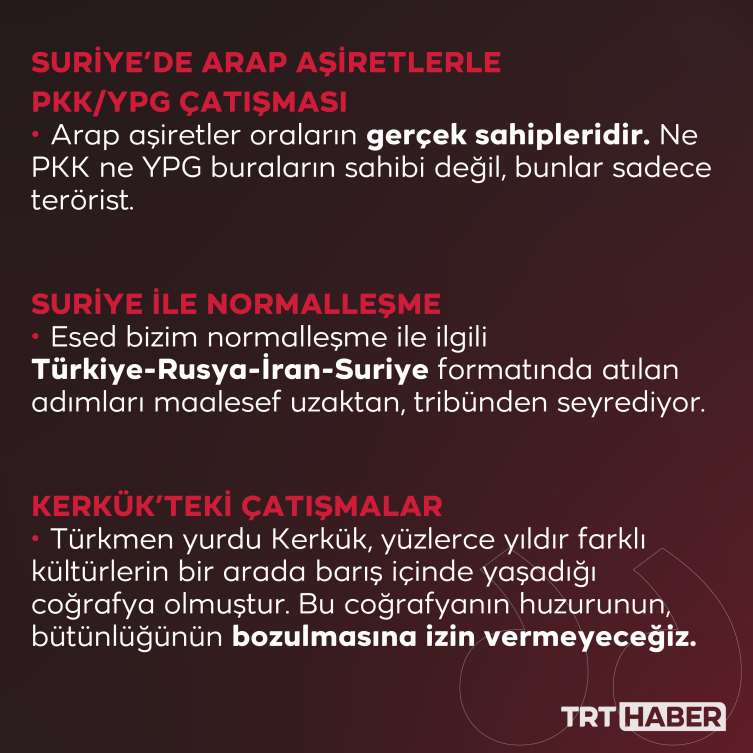 Kerkük konusuyla ilgili olarak gerek Dışişleri Bakanım Hakan Fidan gerekse istihbarat birimlerimiz konuyu sıkı takip ediyorlar. İşin sıkı sıkıya takibi neticesinde gerek Irak Başbakanı Sayın Sudani ile yapılan görüşmeler gerekse oradaki muhataplarıyla yapılan görüşmeler neticesinde şu anda Kerkük’te nispeten sakin bir hava var. Dışişleri Bakanım Hakan Fidan’a ve MİT Başkanı İbrahim Kalın’a durumu yakından takip etmeleri gerektiğini de söyledim.. Barzani ailesiyle görüşmeler yapıldı, Sudani ile görüşmeler yapıldı. Dün de Dışişleri Bakanım Hakan Fidan’ın İran’da yaptığı açıklamalar neticesinde bugün itibariyle hava sakin gözüküyor. Konuyu takip ediyoruz. Bölgenin barış ve huzuru için Kerkük’ün yapısını bozacak faaliyetlerden uzak durulmalı. Kerkük’ün yapısını bozacak her eylem, Irak’ın bütünlüğünün bozulması demektir. Türkmen yurdu Kerkük, yüzlerce yıldır farklı kültürlerin bir arada barış içinde yaşadığı coğrafya olmuştur. Bu coğrafyanın huzurunun, bütünlüğünün bozulmasına izin vermeyeceğiz.