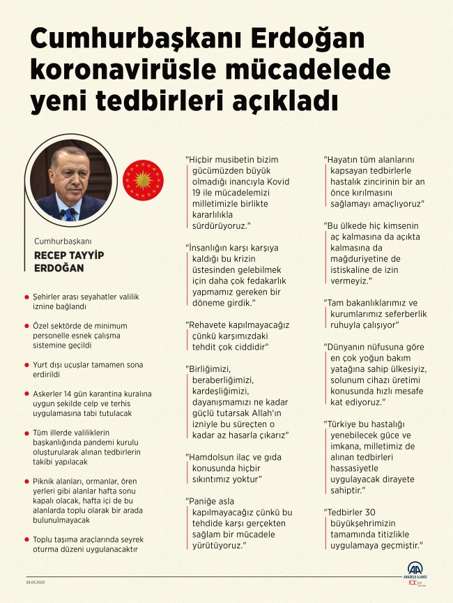 Cumhurbaşkanı Erdoğan: Bu tedbirler 30 büyükşehirde titizlikle uygulanacaktır. Tedbirlerin daha ileri noktalara ulaşmasını istemiyorsak gönüllü karantina şartlarına riayet etmeliyiz.https://t.co/7OhQFzykPd pic.twitter.com/vIb4TVvSf2