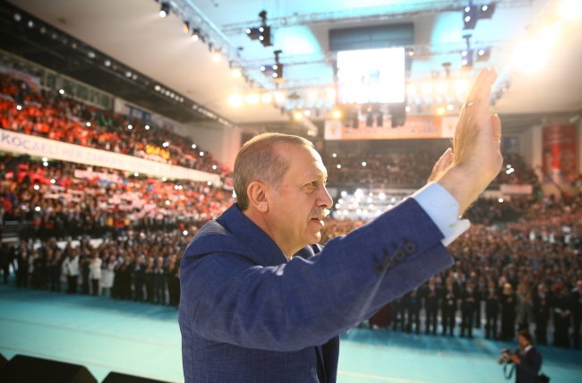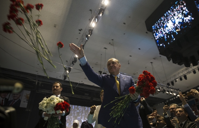 Erdoğan, salona girdiğinde coşkulu kalabalık kendisini uzun süre alkışladı, protokolde kendisi ve eşi Emine Erdoğan için ayrılan yere geçene kadar Başbakan Yıldırım ve eşi Semiha Yıldırım ile partilileri selamladı.