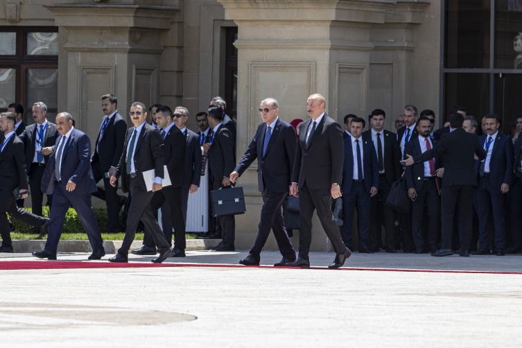 Erdoğan ve Aliyev'in tören alanındaki yerlerini almasının ardından iki ülke milli marşları çalındı.