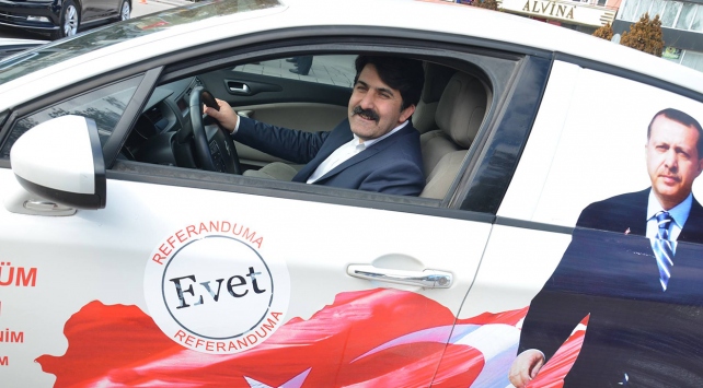 "Güçlü Bir Türkiye İçin Evet" kampanyasına destek amacıyla yola çıkan Özavcı, Türk bayrağı ve Cumhurbaşkanı Erdoğan'ın fotoğraflarının yanı sıra "Biz Türkiyeliyiz", "Dünya liderimizle yeni Türkiye yolunda" yazılarıyla donatılan otomobiliyle kente geldi.