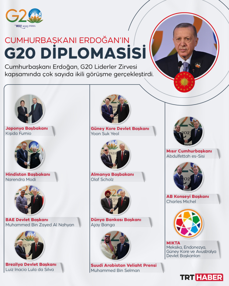 Konakladığı otelde Kişida Fumio'yu kabul eden Cumhurbaşkanı Erdoğan, zirvenin ev sahibi Hindistan Başbakanı Narendra Modi ile Bharat Mandapam Uluslararası Fuar ve Kongre Merkezi'ndeki karşılama töreninde ayaküstü sohbet etti.