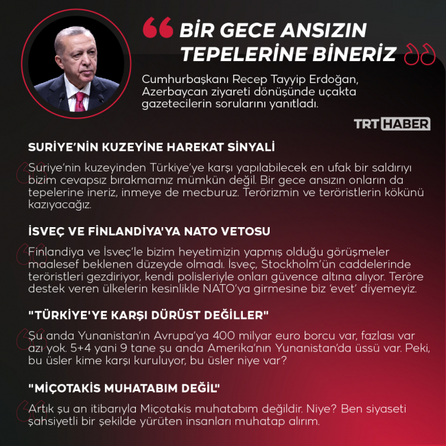Erdoğan, Azerbaycan ziyareti dönüşünde uçakta gazetecilere değerlendirmelerde bulundu, soruları yanıtladı.