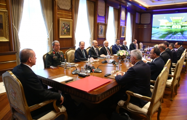 Erdoğan başkanlığındaki toplantıya Başbakan Binali Yıldırım, Başbakan yardımcıları Bekir Bozdağ ile Recep Akdağ, İçişleri Bakanı Süleyman Soylu, Dışişleri Bakanı Mevlüt Çavuşoğlu, Milli Savunma Bakanı Nurettin Canikli, Genelkurmay Başkanı Orgeneral Hulusi Akar, MİT Müsteşarı Hakan Fidan, Cumhurbaşkanlığı Genel Sekreteri Fahri Kasırga, Cumhurbaşkanlığı Sözcüsü İbrahim Kalın ile Başbakanlık Müsteşarı Fuat Oktay da katıldı.