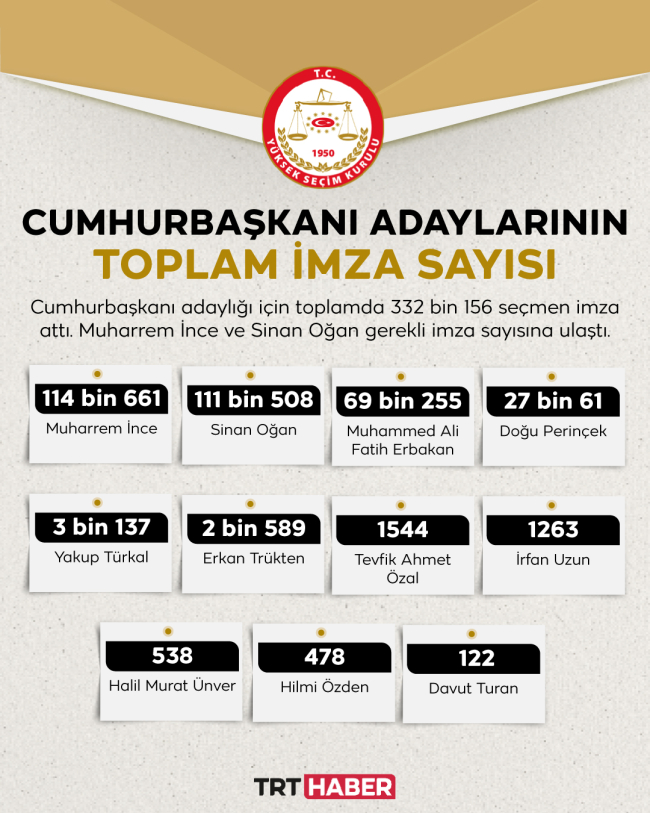 "Kurulumuz imza sürecinin sona ermesinden sonra yapmış olduğu toplantılar sonucunda 14 Mayıs 2023 tarihinde yapılacak olan Cumhurbaşkanı Seçimi ve 28. Dönem Milletvekili Genel Seçimi'nde cumhurbaşkanı adaylarının alfabetik sırayla Sayın Kemal Kılıçdaroğlu, Sayın Muharrem İnce, Sayın Recep Tayyip Erdoğan ve Sayın Sinan Oğan olduğunun tespitine karar vermiş olup, karar Resmi Gazete'de ilan edilmek üzere gönderilmiştir."