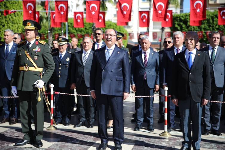 Mersin'de Cumhuriyet Alanı'nda düzenlenen törende Vali Ali Hamza Pehlivan, Tuğamiral Tayfun Karataş ve Büyükşehir Belediye Başkanı Vahap Seçer, Atatürk Anıtı'na çelenk bıraktı.